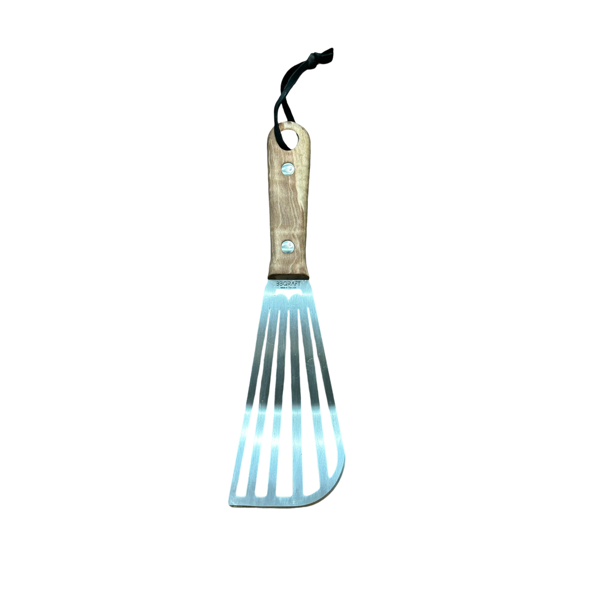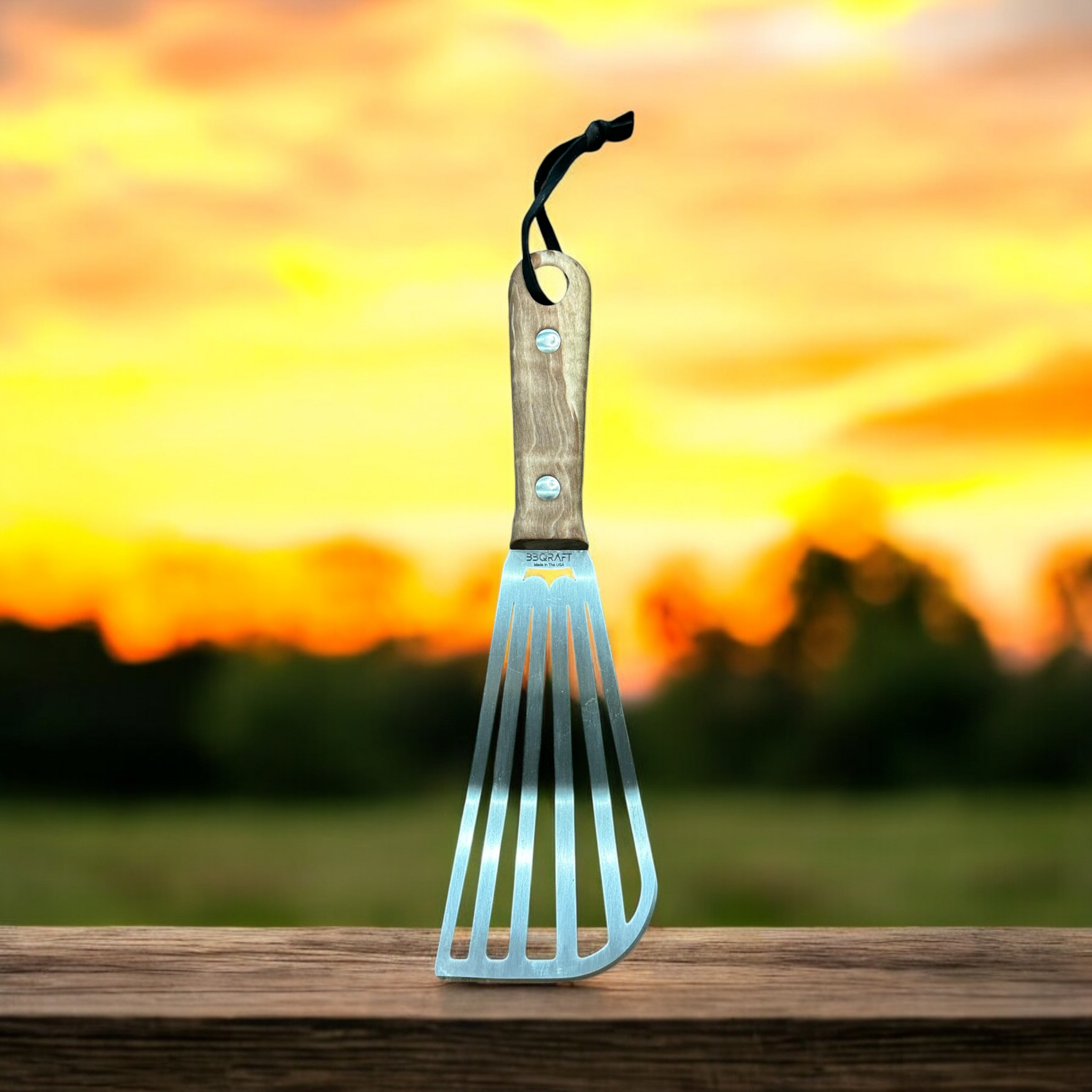 The Excalibur Fish & Veggie Spatula is perfect for grill cooking of delicate items such as fish and vegetables. It also boasts a large radius corner that works perfectly when grilling in your favorite cast iron skillet. This spatula is also fantastic when cooking bacon as it allows the bacon grease to flow right thru the open design.