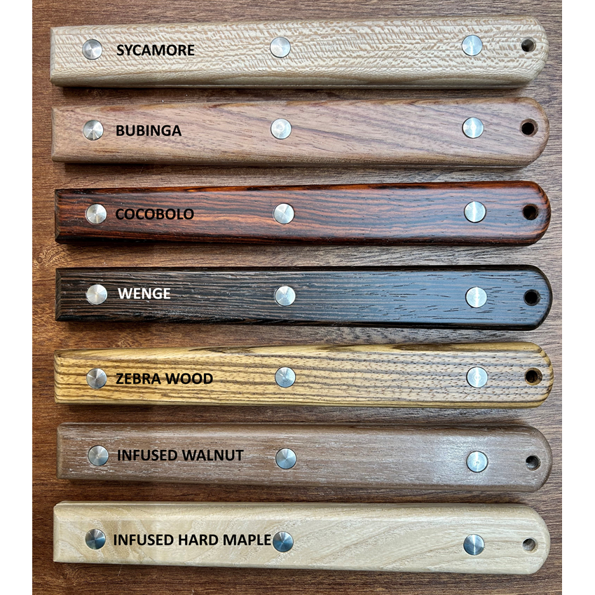 We offer several beautiful hardwood handle styles for you to choose from. What sets BBQraft's Excalibur line apart from any other tool on the market is the ability to switch your scales (handles) out with new scales at any time since our tools are assembled with removable 601SS barrel bolts.