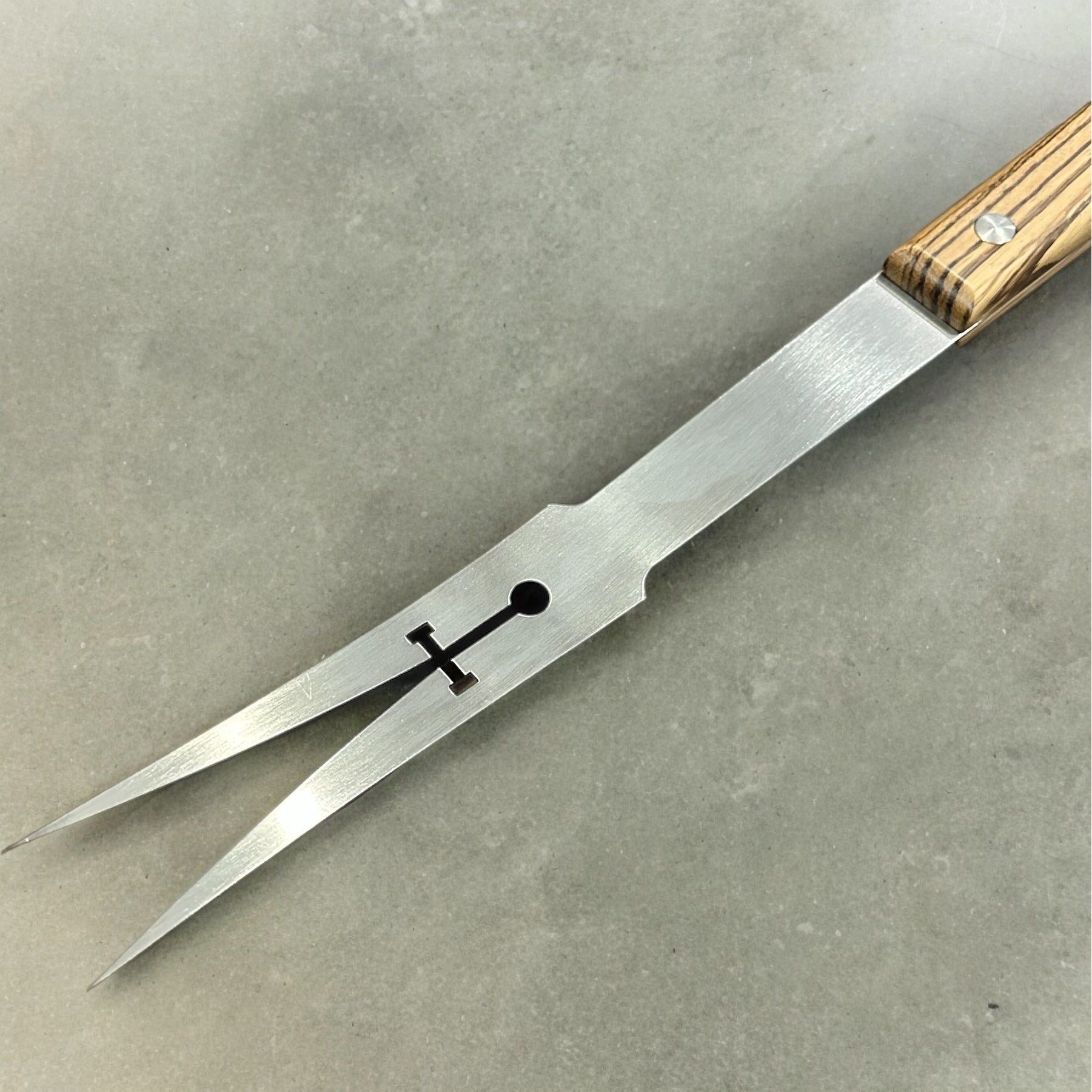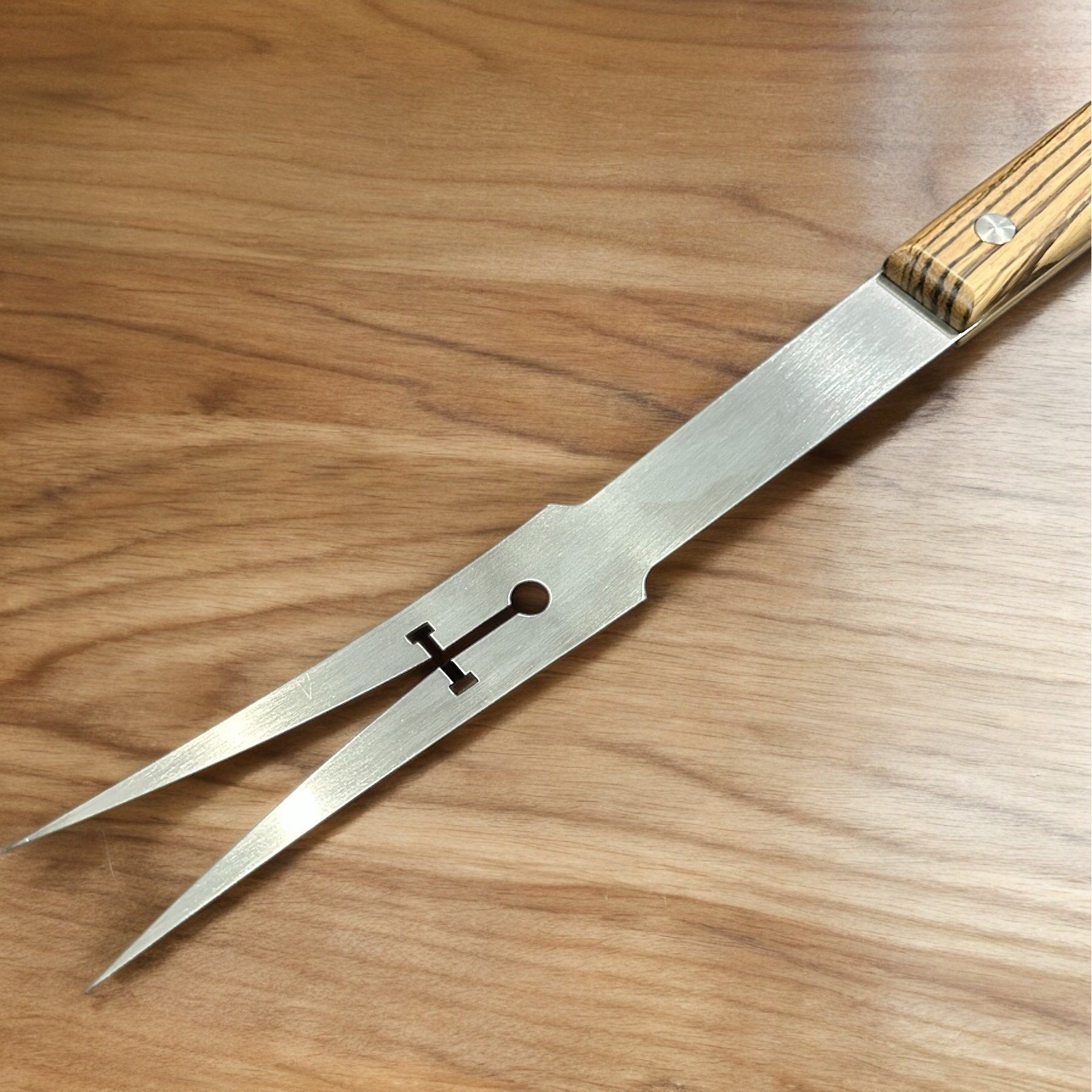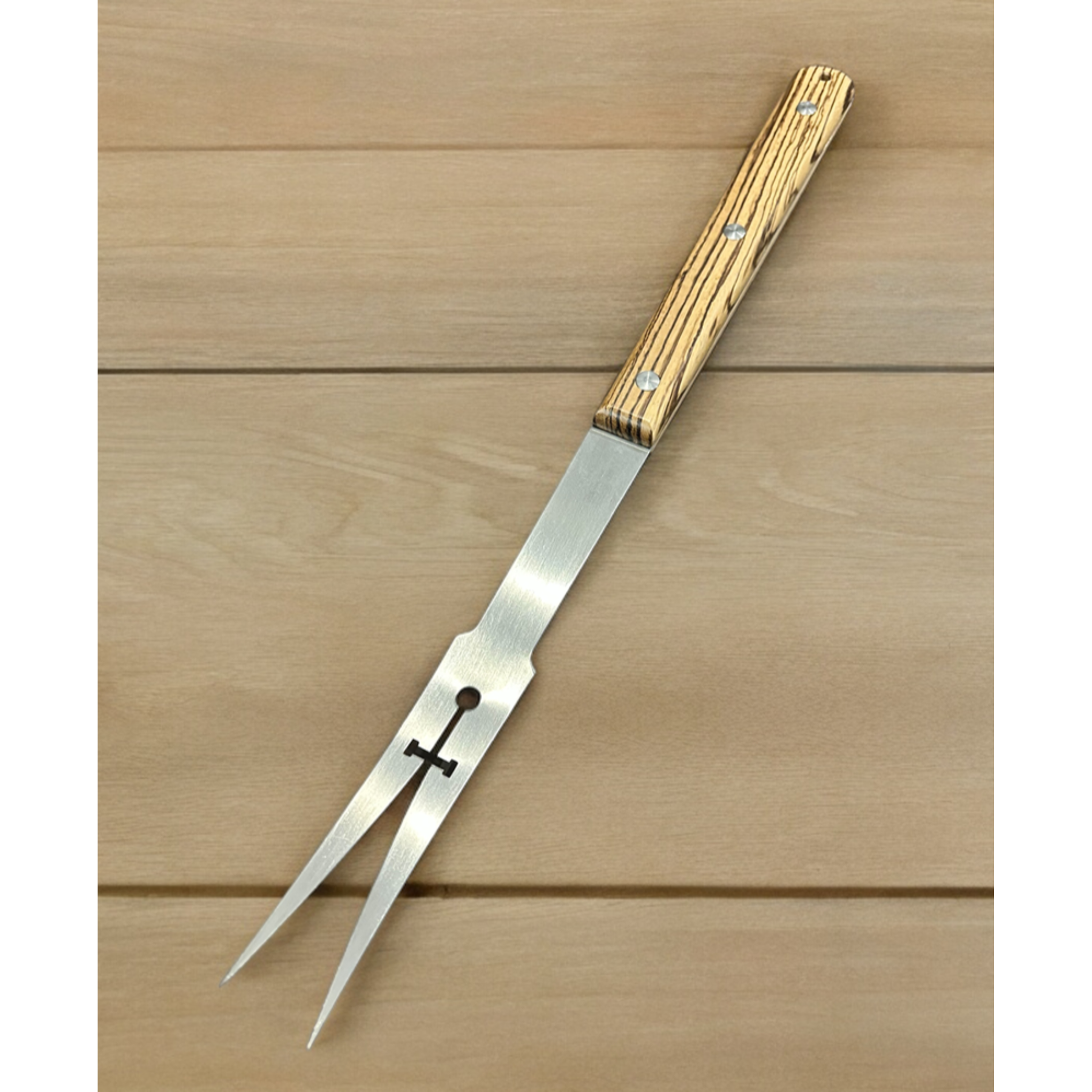 The Excalibur 20" Grill Fork is meticulously crafted in the heart of Ohio in the small town of Dundee. Utilizing state of the art laser cutting technology we cut out thick 604SS blanks that are then hand ground and formed prior to having beautifully machined and hand sanded exotic wood handles applied using stainless steel binding bolts.