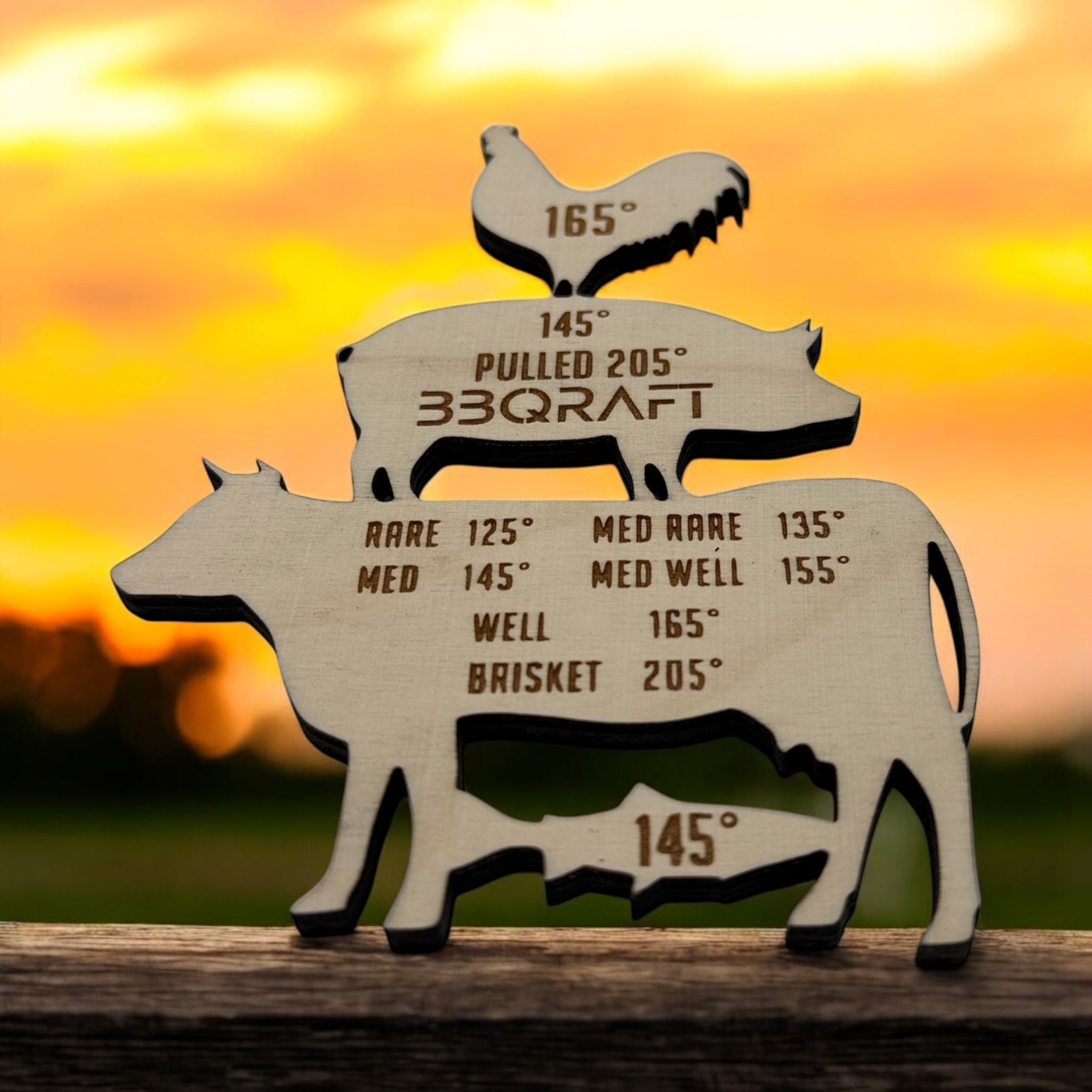 Everybody needs this handy reminder of meat temperatures in their grilling station or around their kitchen stove.  This laser cut handy wooden gauge identifies meat temps for Poultry, Fish, Pork, and Beef.  The creative design allows you to easily identify the meat group and the temps required.  Measures 4" wide x 5 1/4" Tall and 1/4" thick.  Includes a 3/4" round magnet for easy placement to most metal surfaces.